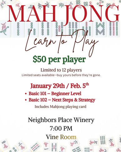 Curious about Mahjong but not sure where to start? Join us in the Vine Room for a fun, relaxed Learn to Play Mahjong class at Neighbors Place Winery. This guided class is perfect for beginners or those ready to build confidence and strategy.